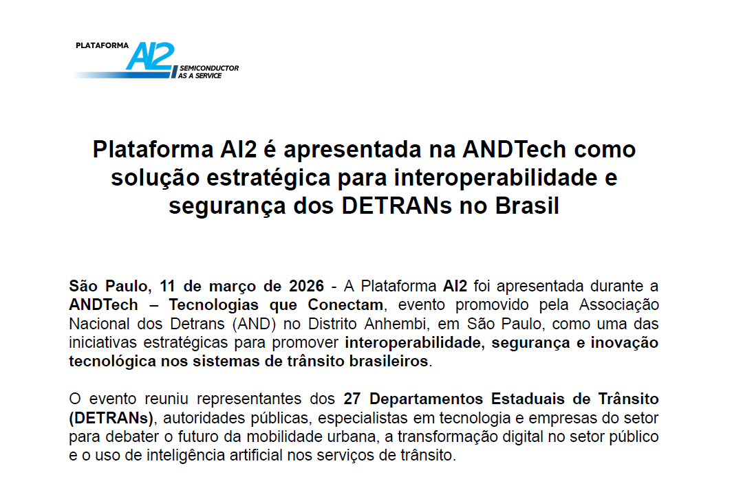 Em Março de 2026, aconteceu a ANDTech 2026 (ANDTech Tecnologias que Conectam), evento promovido pela Associação Nacional dos Detrans (AND) no Distrito Anhembi, em São Paulo-SP, que reuniu representantes dos 27 Departamentos Estaduais de Trânsito (DETRANs), autoridades públicas, especialistas em tecnologia e empresas do setor e serviu como palco para a apresentação de iniciativas voltadas à interoperabilidade, segurança e inovação tecnológica nos sistemas de trânsito brasileiros. Durante sua programação, foi apresentado o projeto piloto (MVP) da Plataforma AI2, demonstrando o uso de chips em placas veiculares para fins de fiscalização e monitoramento.